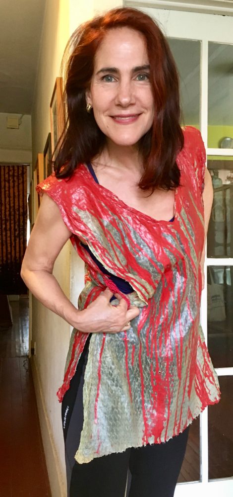 Here I’m goofing off while my fine artist friend Connie DK Lane fits some of her designs for her upcoming show, “Bravura.” Too shy to model? Visit us anyway. Connie’s art will be displayed the entire week.