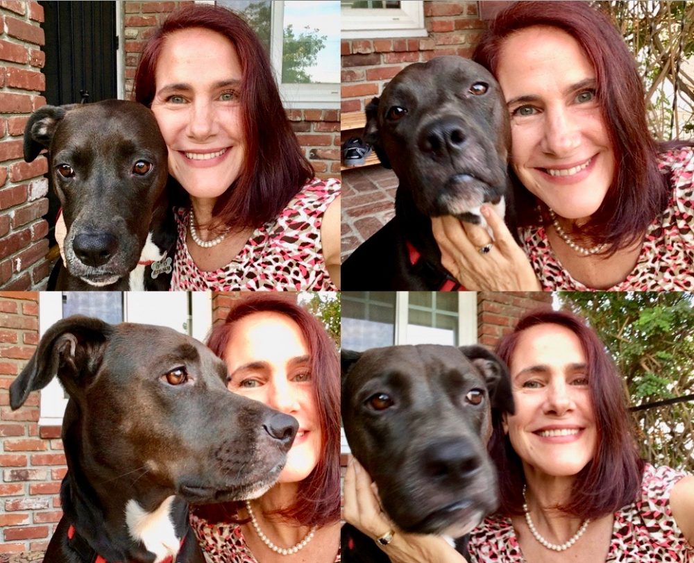 4 headshot photos of da-AL with her labrador pit bull mix dog