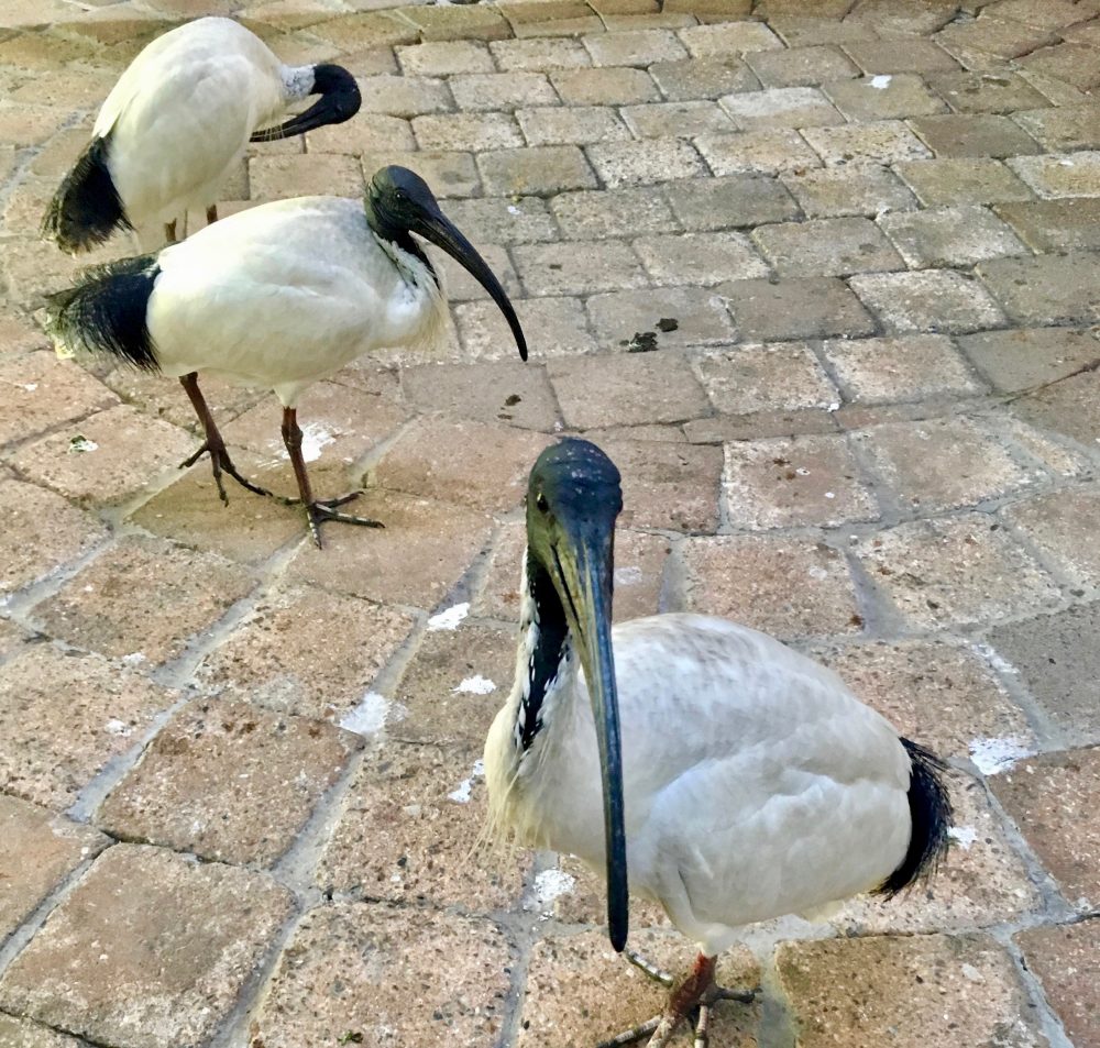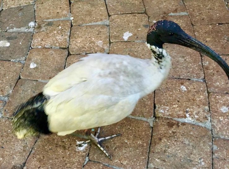 We have pigeons — they have ibis! Now, this is one impressive bird! Its pate is bald yet pleated and striped, it’s long bill curves, and it’s feet and legs are as sturdy as avian appendages come.