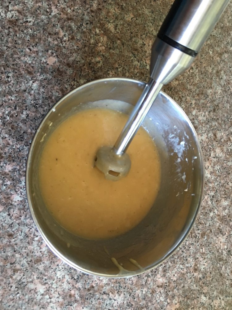 3. In a large bowl, use a hand blender to combine the banana, honey, and butter. Add in the thick yogurt and fruit.