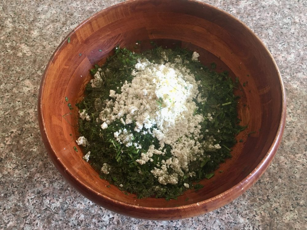 There. Oh, and exotic yet familiar, green and healthy, yet decadent. Easy but a bit time consuming so make enough for a few meals. It’s filled with everyday ingredients like bread and cheese, but with the added specialness of a not-your-run-of-the-mill sort. Lavash (a soft, thin unleavened flatbread available at many grocers) and feta,(a cheese made from the milk of cows or goats or sheep) and greens that are best eaten raw yet go cosmos-beyond lettuce and spinach. Things of which the mere scent of them are heaven!!! These are fresh herbs such as dill, tarragon (worthy of making into a perfume though one might get bitten…) and parsley and cilantro. If you’ve got more, great, but if you haven’t got these, all is forgiven because most any green leafy goodness will do.