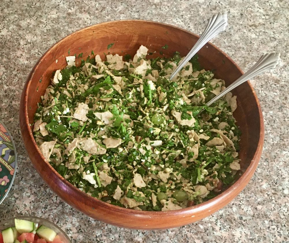 There—I’ve said it—onto the recipe. Oh, and it’s my husband’s own making, a melange of cultures, and personal preferences. It’s a reworking of a Turkish chopped herb salad.