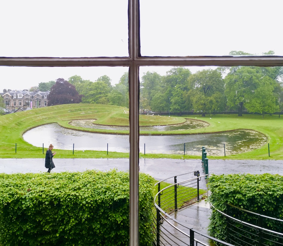 Here’s Landform by Charles Jencks beyond rainy windows (rain-less view here) of the Scottish National Gallery of Modern Art in Edinburgh…