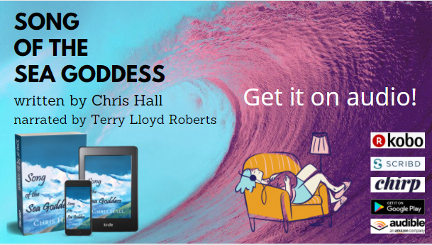 Graphic describing how "Song of the Sea Goddess" is available as an audiobook.