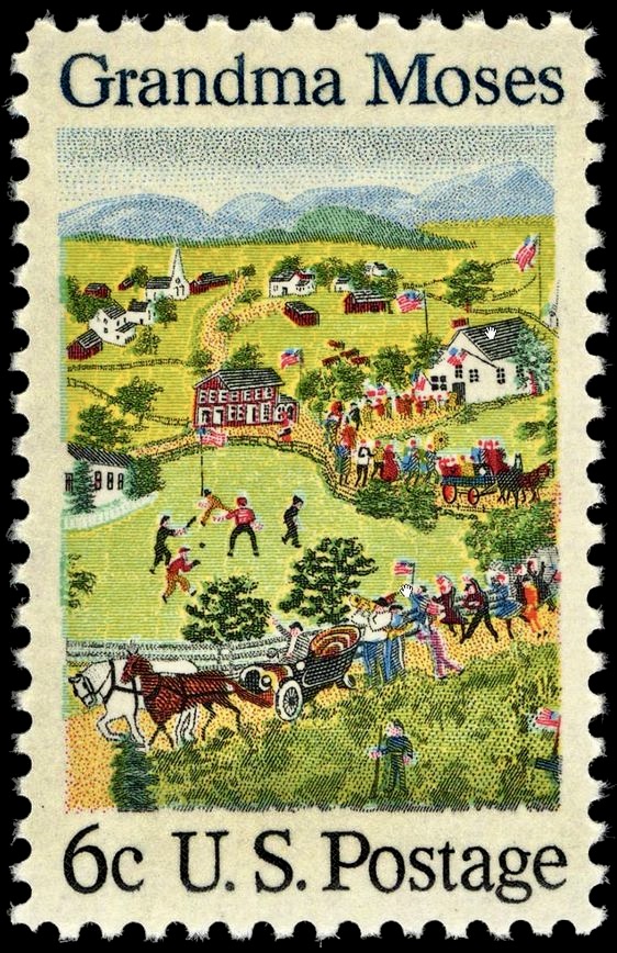 American folk artist of worldwide fame, Grandma Moses (Anna Mary Robertson Moses, September 7, 1860 – December 13, 1961) grew up humbly; farming as a child, at twelve leaving home to work, and later giving birth to ten children, only five of who lived past infancy. She’d always loved creating beauty out of nothing, but it wasn’t until she turned 78 that arthritis forced her to take up painting. When one hand tired, she’d switch to the other.