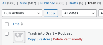 3. To duck your old post out of sight for however long you want, without losing all the SEO goodness it’s racked up, you can trash it. Once it’s in your trash, hover under the title and select ‘restore.’ Now it’s converted into a draft. Once in your drafts folder, update it as you please. Make sure you revise the publish date to a few minutes or more into the future. Now it’ll publish anew and show at the top of your posts list.