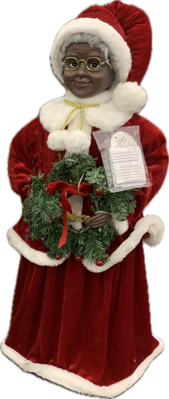 Photo of black woman santa statuetteRecently, my mom was getting her Covid booster, and since I’d already had mine, I browsed about the drug store. (Anything can be inspirational to a writer, no?About my books here.)